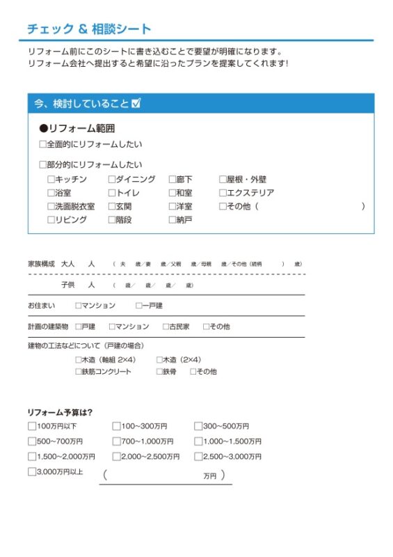 せっかくのリフォームです。後で後悔することのないよう、しっかりと要望をまとめて下さい。