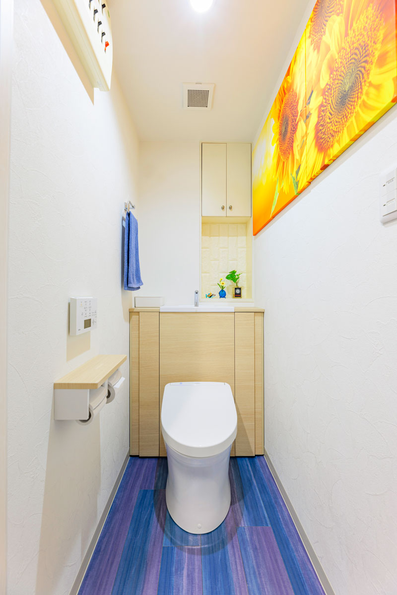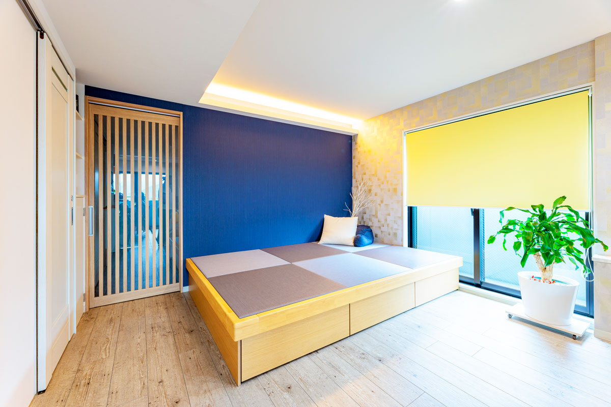 インテリアは和と北欧を融合させた“ジャパンディ”をテーマにコーディネート。床は明るい木目調のフロアタイルを選び、キッチン、クロス、家具や小物のカラーや縦格子デザインをポイントに効かせたセンスの良い空間に。ダウンライトと間接照明はエリアごとに調光・調色可能にして、シーンによって演出を楽しめるようにしました。