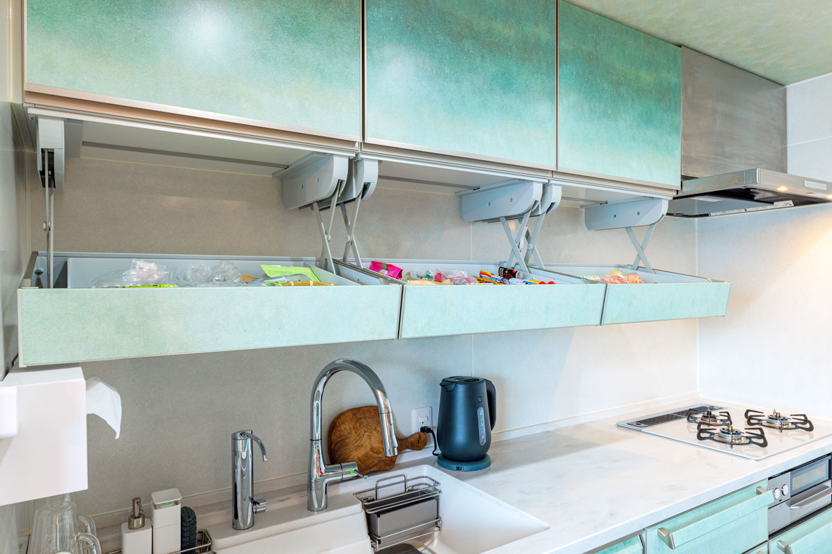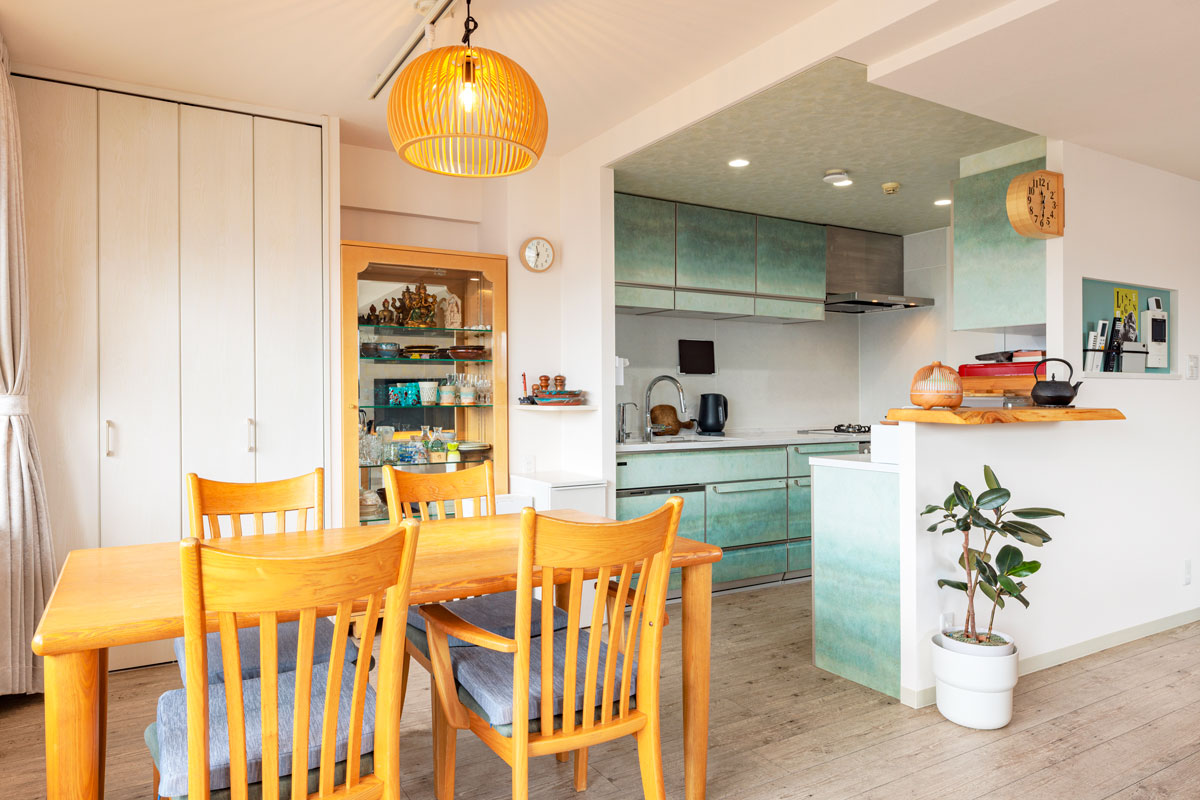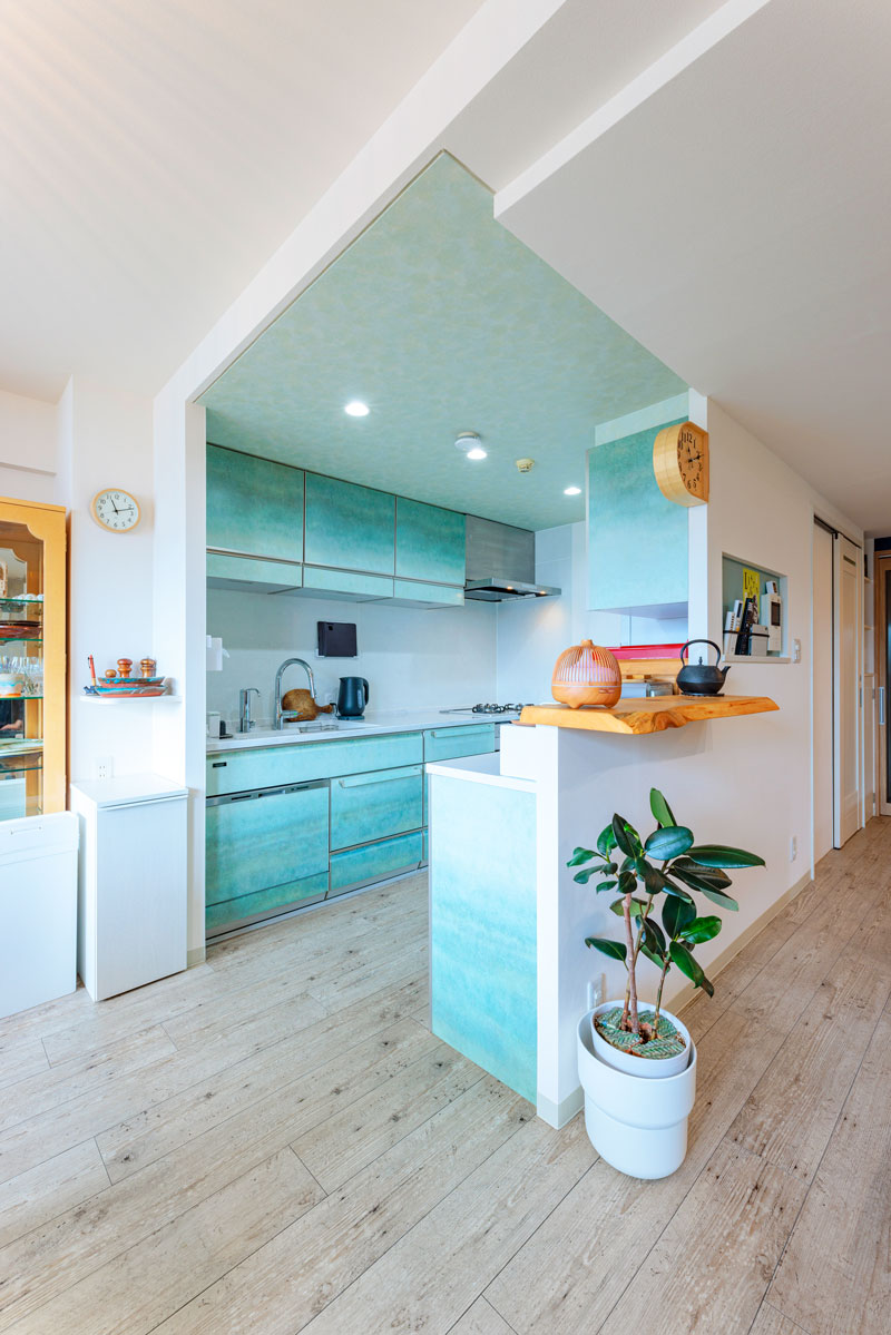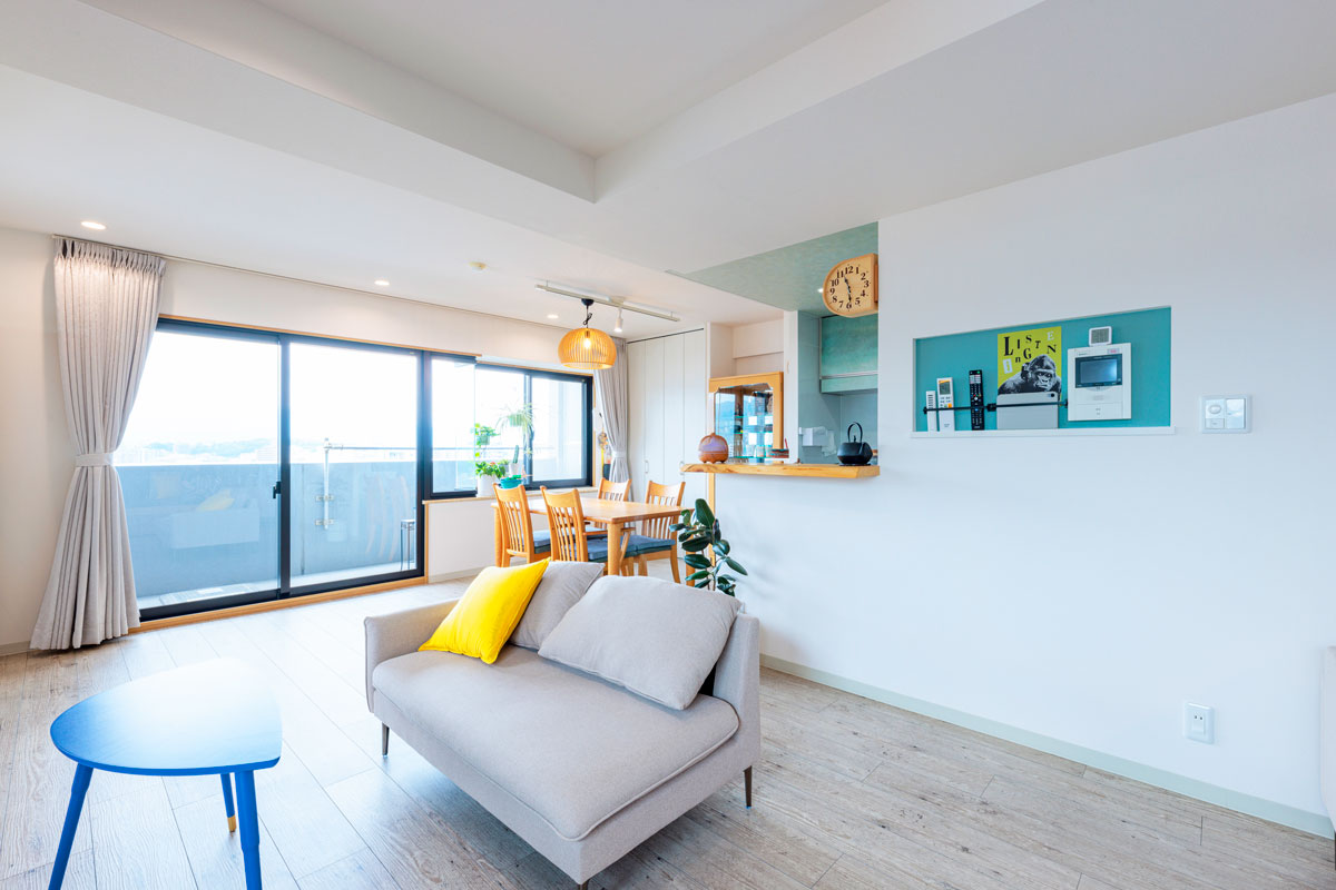 強く希望したのは、一番滞在時間の長いLDKをゆったりと快適に過ごせる空間に変えること。狭く感じさせる要因になっていた和室とキッチンの間仕切りをなくし、6帖の和室は3帖のオープンな小上がりに。キッチンは、LDとつながるI型に変更して、開放的なLDKを実現しました。