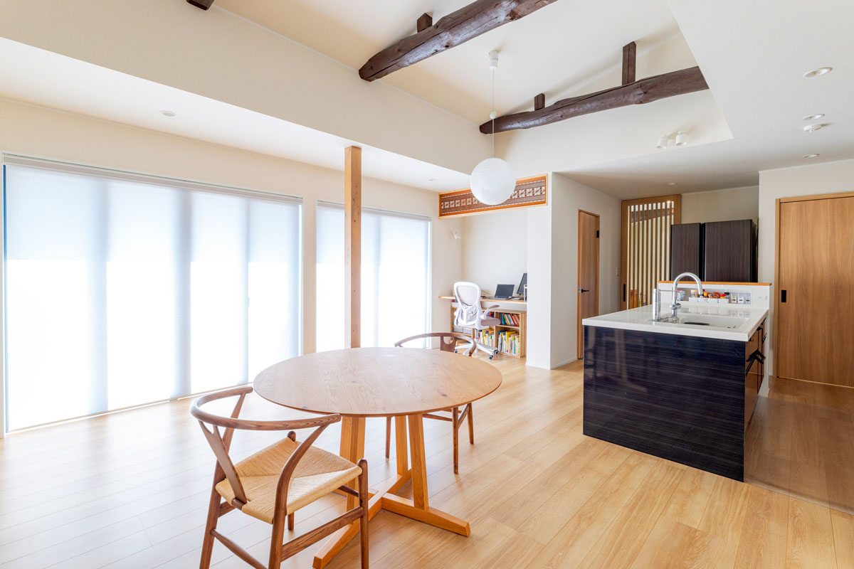 間取りでは、希望した広いLDKを日当たりの良い空間をつないで実現。現しにした梁や再利用した欄間をアクセントに、木のぬくもりを感じるセンスのいい空間に仕上げました。