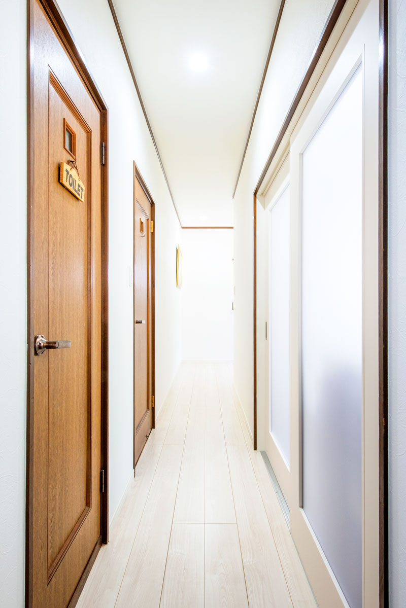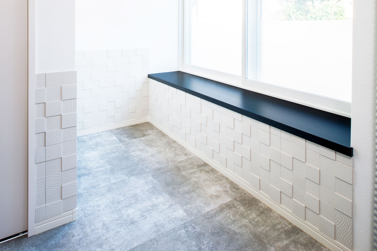担当の山縣さんは広くしたLDKの床に、傷に強く汚れも目立たないグレーのフロアタイルを提案。建具はサイズオーダーで白い引き戸に統一。枠は既存のものにシートを貼るなど、活用できるものは再利用しつつ、モノトーンカラーの洋室に一新しました。