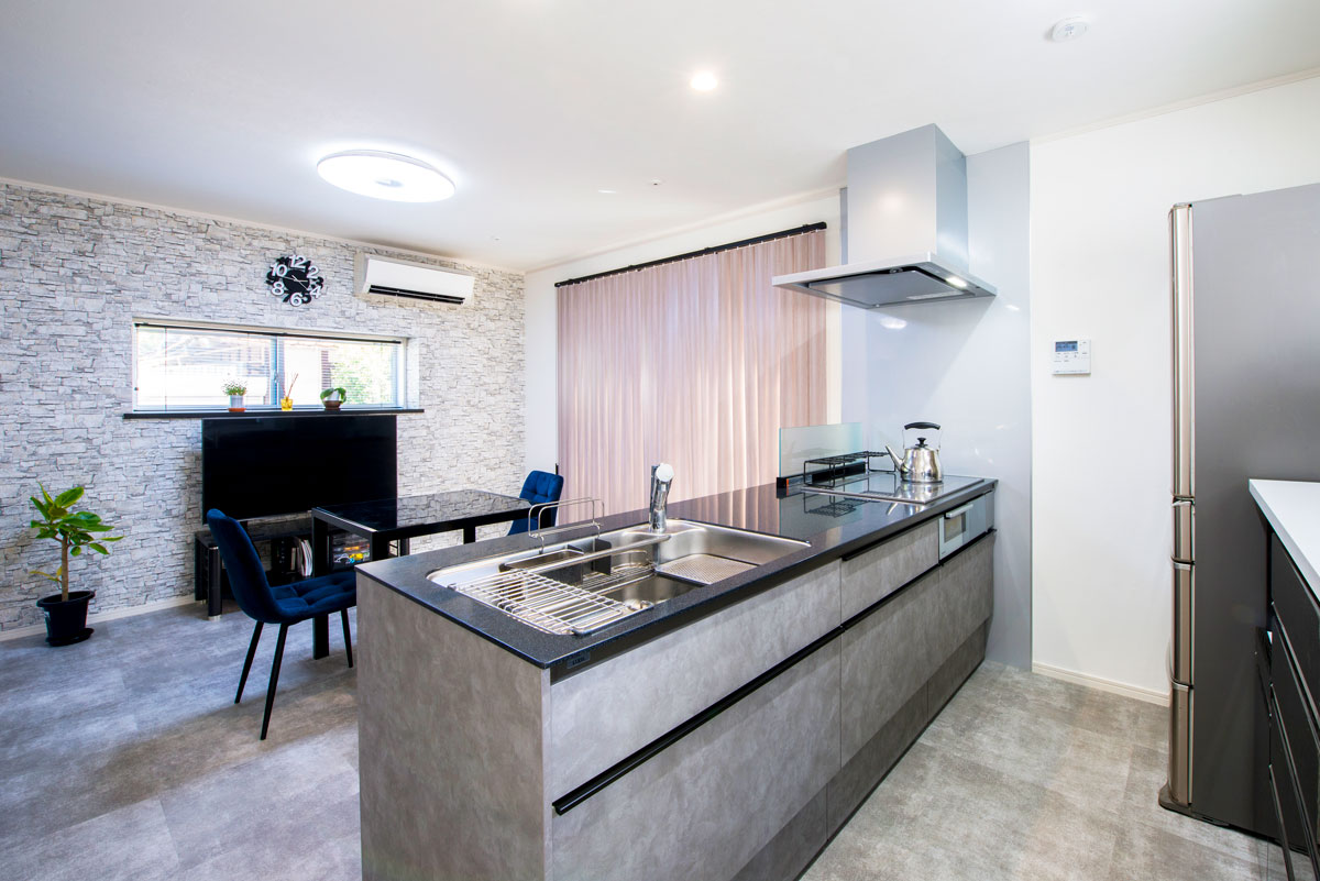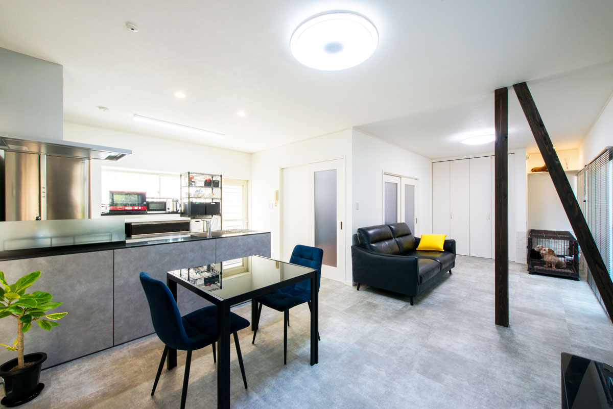 希望したのは、DKに隣接する和室を取り込んで、ソファが置ける広いLDKにすること。テレビを見ながら料理を楽しめる対面キッチンにすること。愛犬たちのスペースをつくること。そして黒、白、グレー、シルバーでまとめた格好いい空間に変えること。