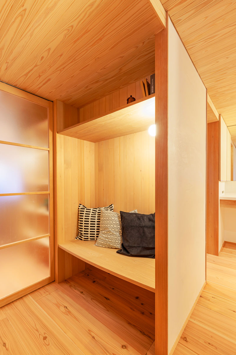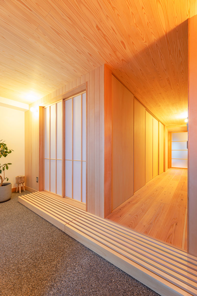 マンションの一室に踏み入れた瞬間に広がる、木のぬくもりに包まれる空間。歩いて、触れて、職人の細やかな手仕事を実感することができます。