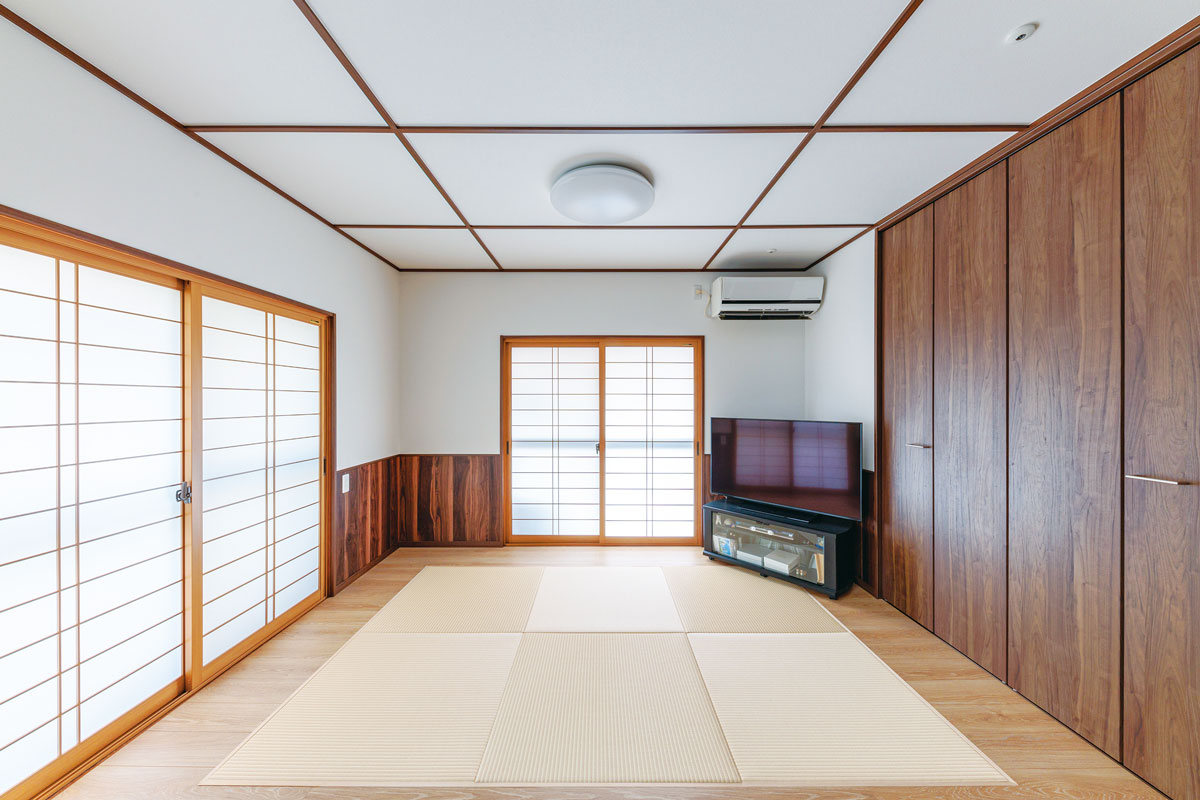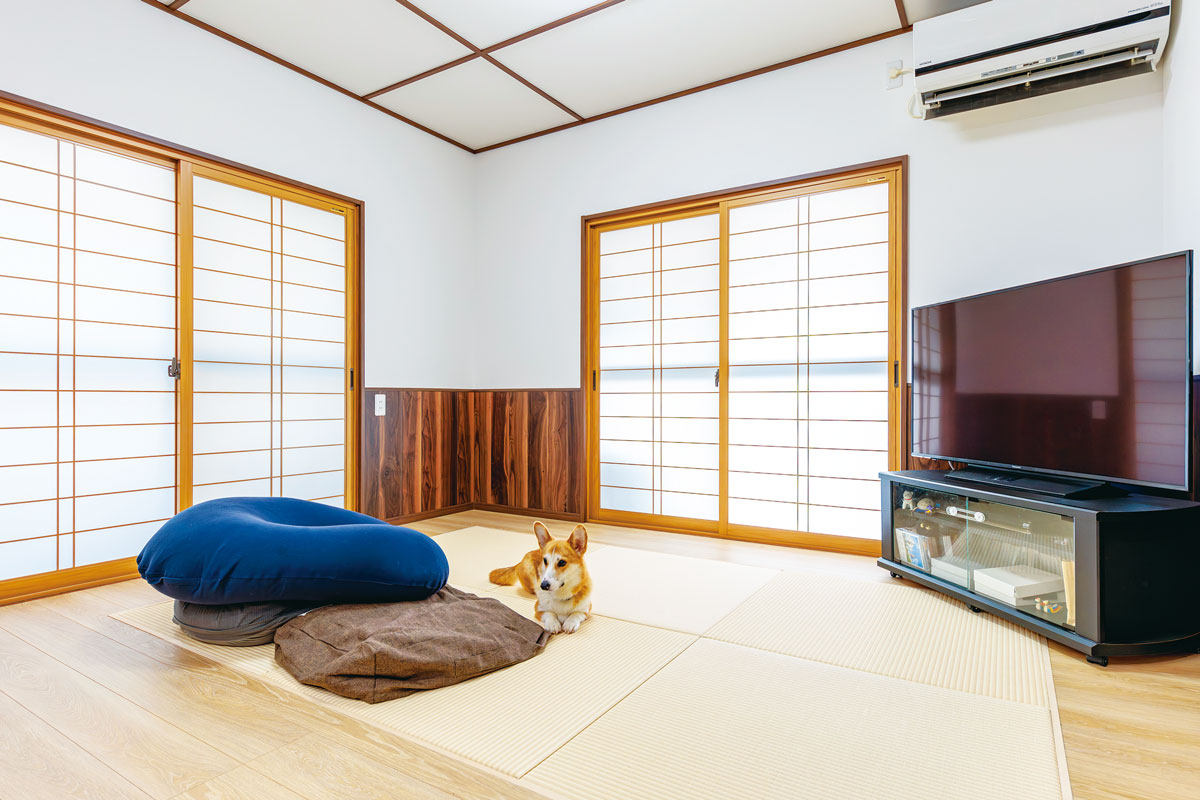 戸襖の敷居につまずきリスクがあったDKと和室は、間仕切りの無いひと続きのLDKに変更。元の和室の中央に畳スペースを設けて、障子風内窓の和の雰囲気を活かしたリビングに。壁は愛犬による傷や汚れを気にせず過ごせるように、腰壁を張りました。
