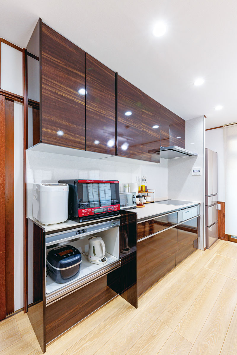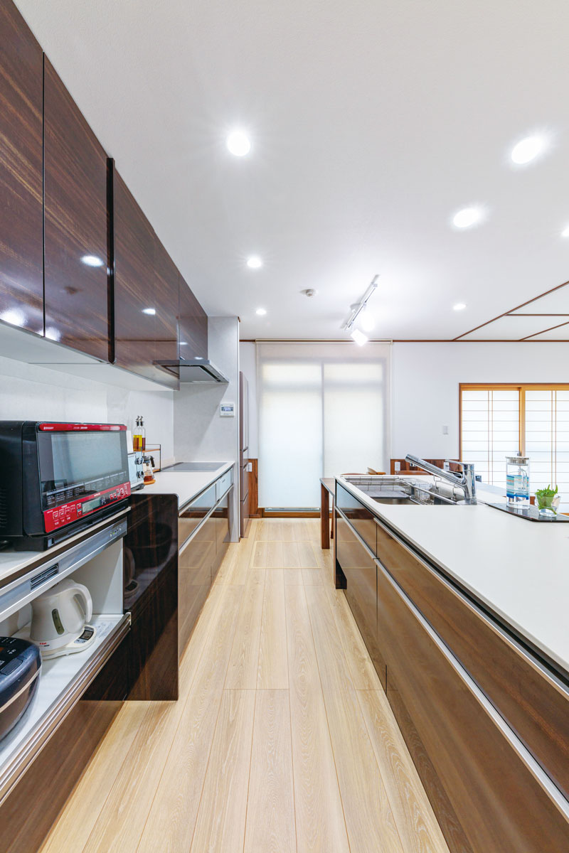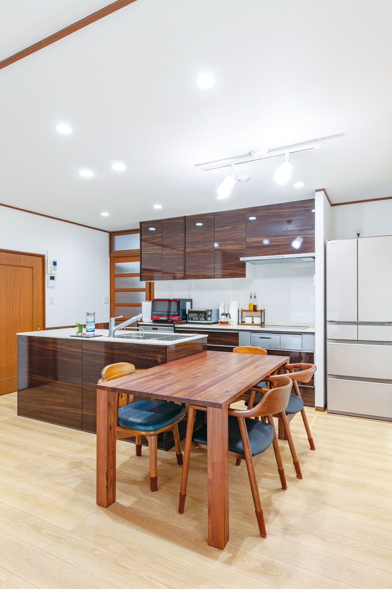 家電や食器棚と離れ、家事動線が悪かったキッチンも見直し。壁側に冷蔵庫、コンロ、カップボードを並べ、シンクと調理台はオープンなアイランドにして、必要な物にすぐ手が届くⅡ型に。シンク横にはダイニングテーブルの空間を確保して、配膳や後片づけの移動距離を短くしました。