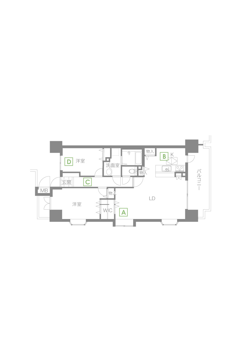 - D:玄関の両側に2つの洋室がある、2LDKの間取りでした。