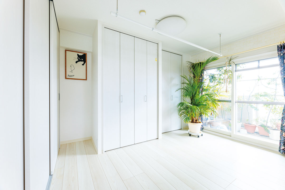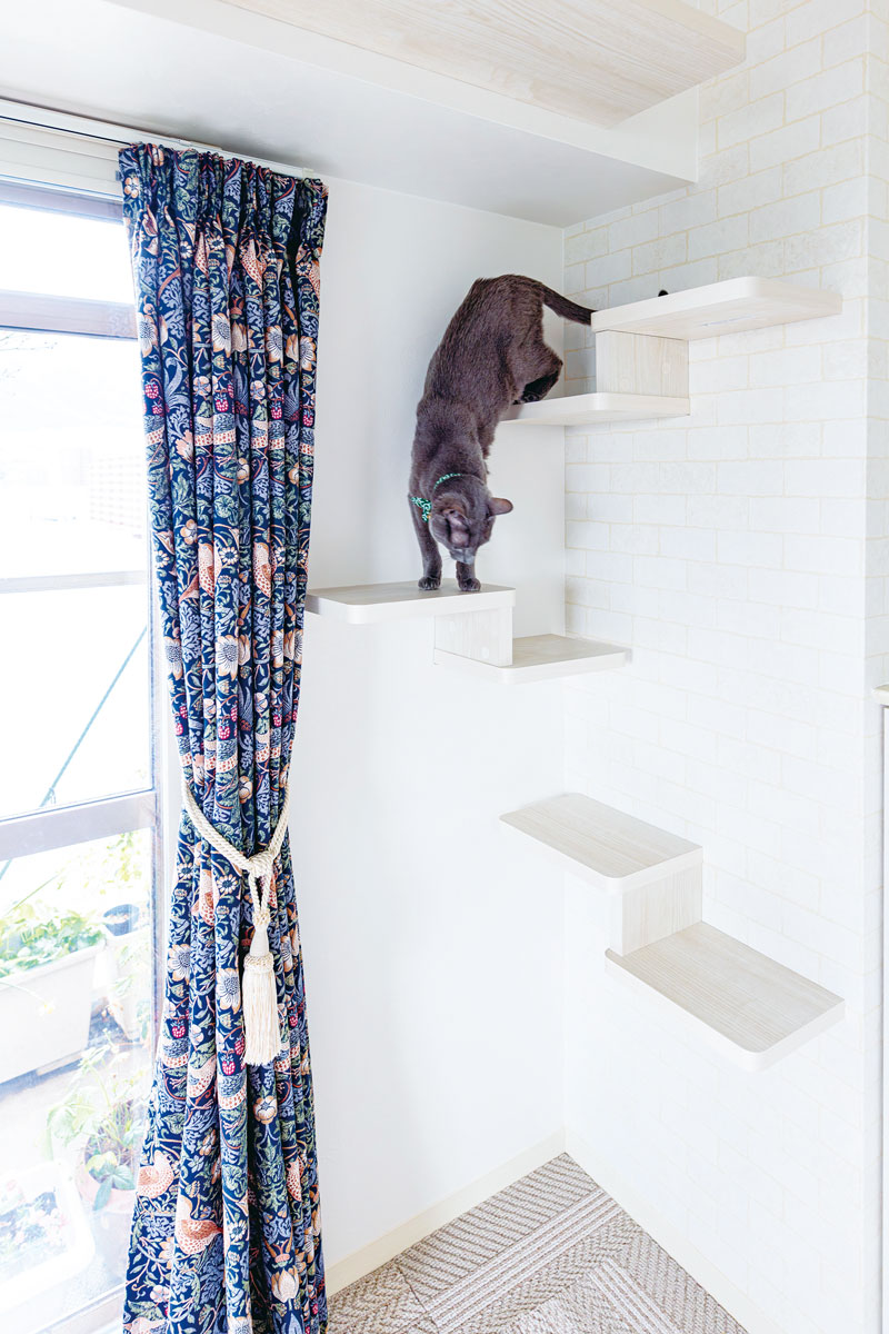 床には、猫はもちろん人間も滑りにくいオフホワイトのペット対応フローリングを選択し、壁や建具も明るい白色に。担当の吉田さんからの、補助金を活用した内窓設置案を採用し、窓枠も白に揃えて、より統一感のある明るい空間に仕上がりました。