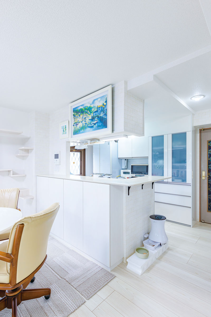廊下と高さを合わせるために、防音床下地を組み直す必要が生じたLDKは、この機会に大きく見直し。LDに隣接していた和室を取り込んで広く使えるワンフロアに変え、古くなっていたキッチンを交換して袖壁や垂れ壁を無くして明るく。LDの一角には、キャットウォークを設けました。