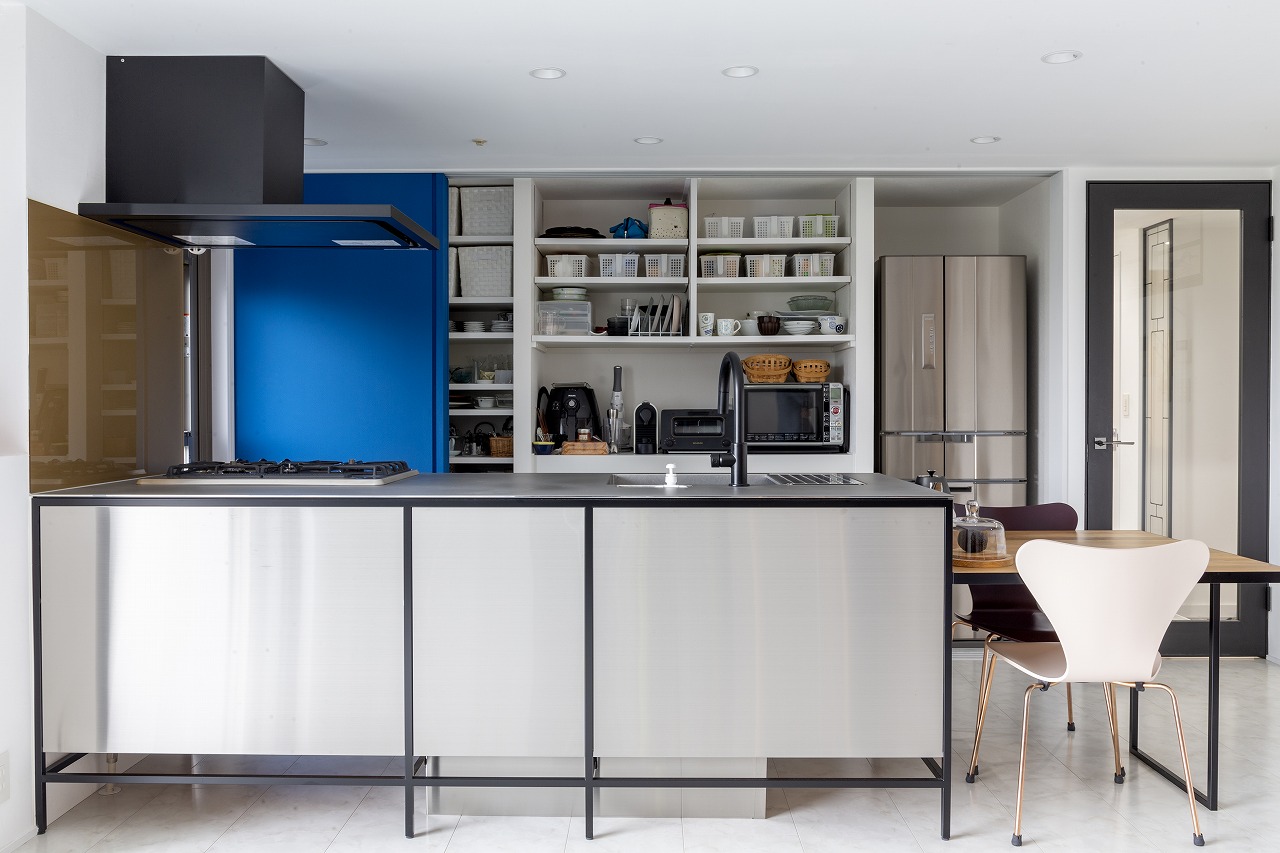 「デザインと使い勝手の両方を追求しました」と、奥さま。パリにあるホテルをイメージした、印象的なキッチンのブルー。天井まである引き戸をスライドさせると、食器類や調理家電、冷蔵庫までが収まるパントリーに。洗浄力が強く、容量の大きいドイツ製の食洗機を使いたいと、サイズ調整できるオーダーキッチンを選ぶなど、細部まで使いやすさと美意識がゆきとどいた、魅力に満ちた住まいが完成しました。