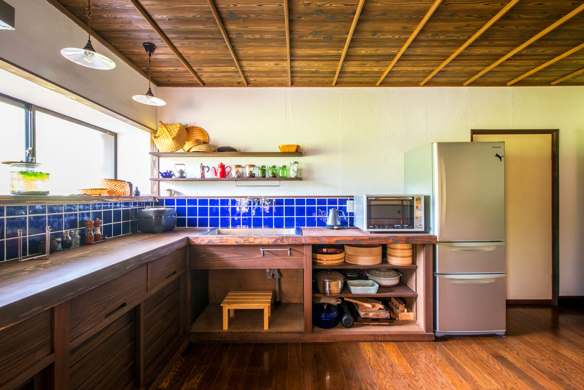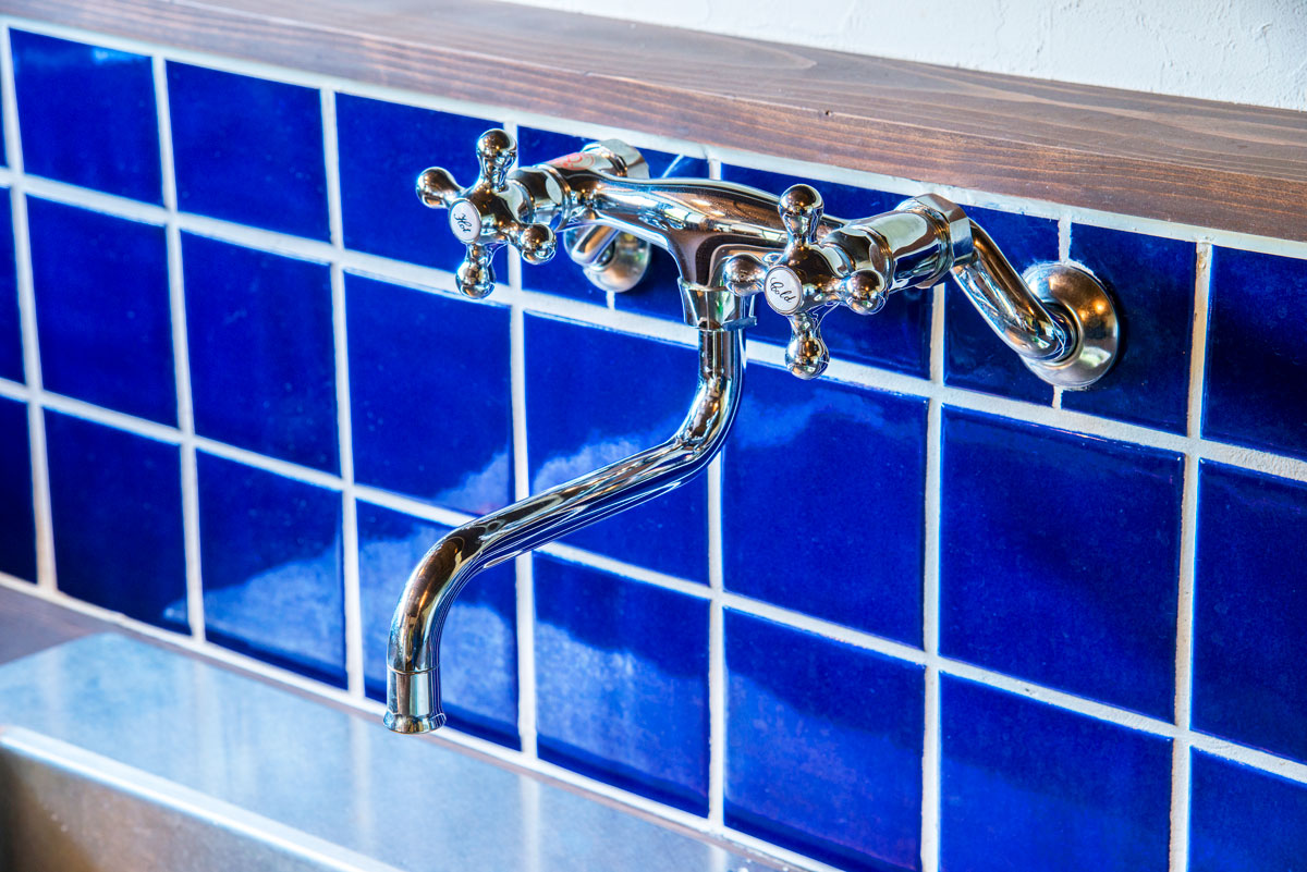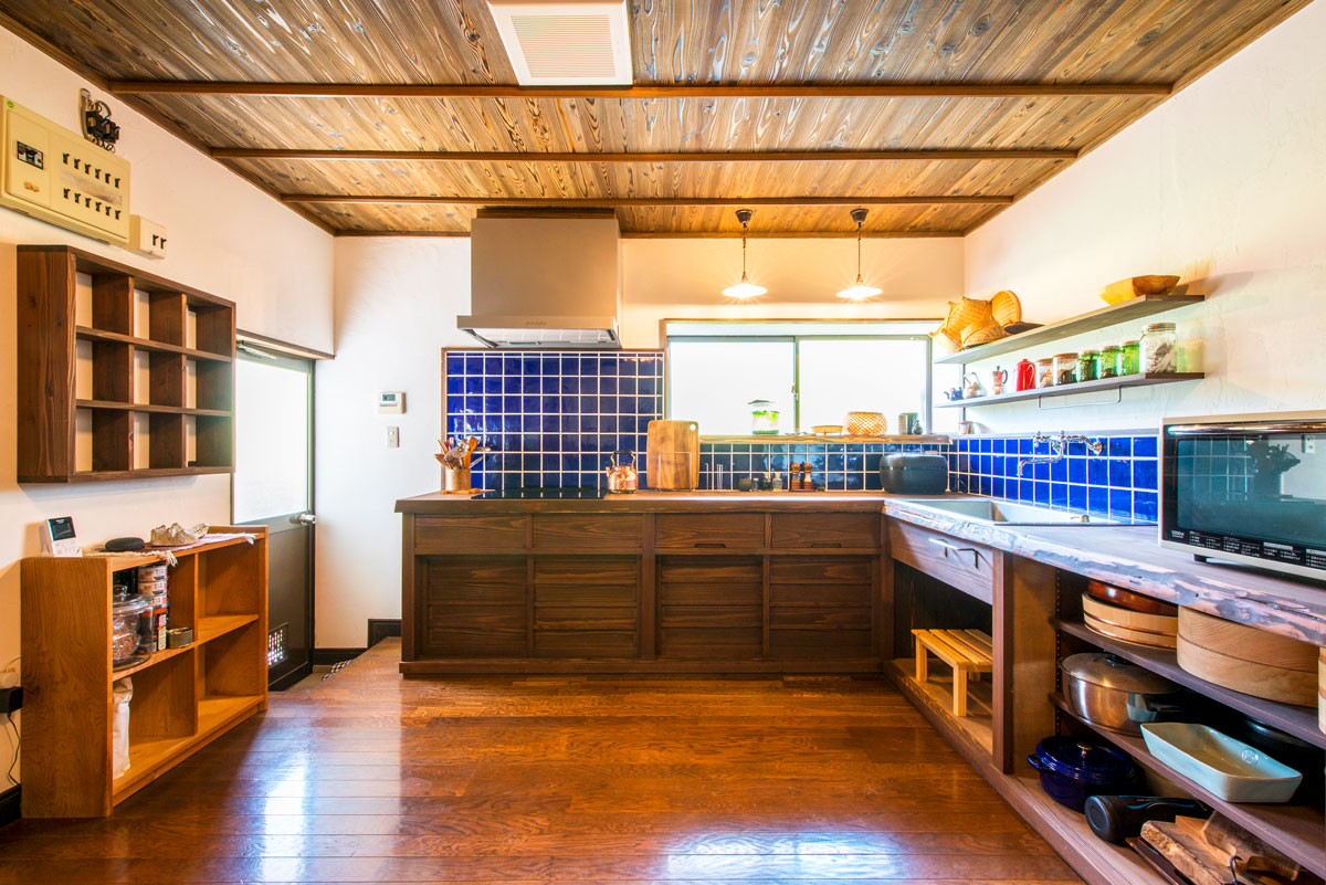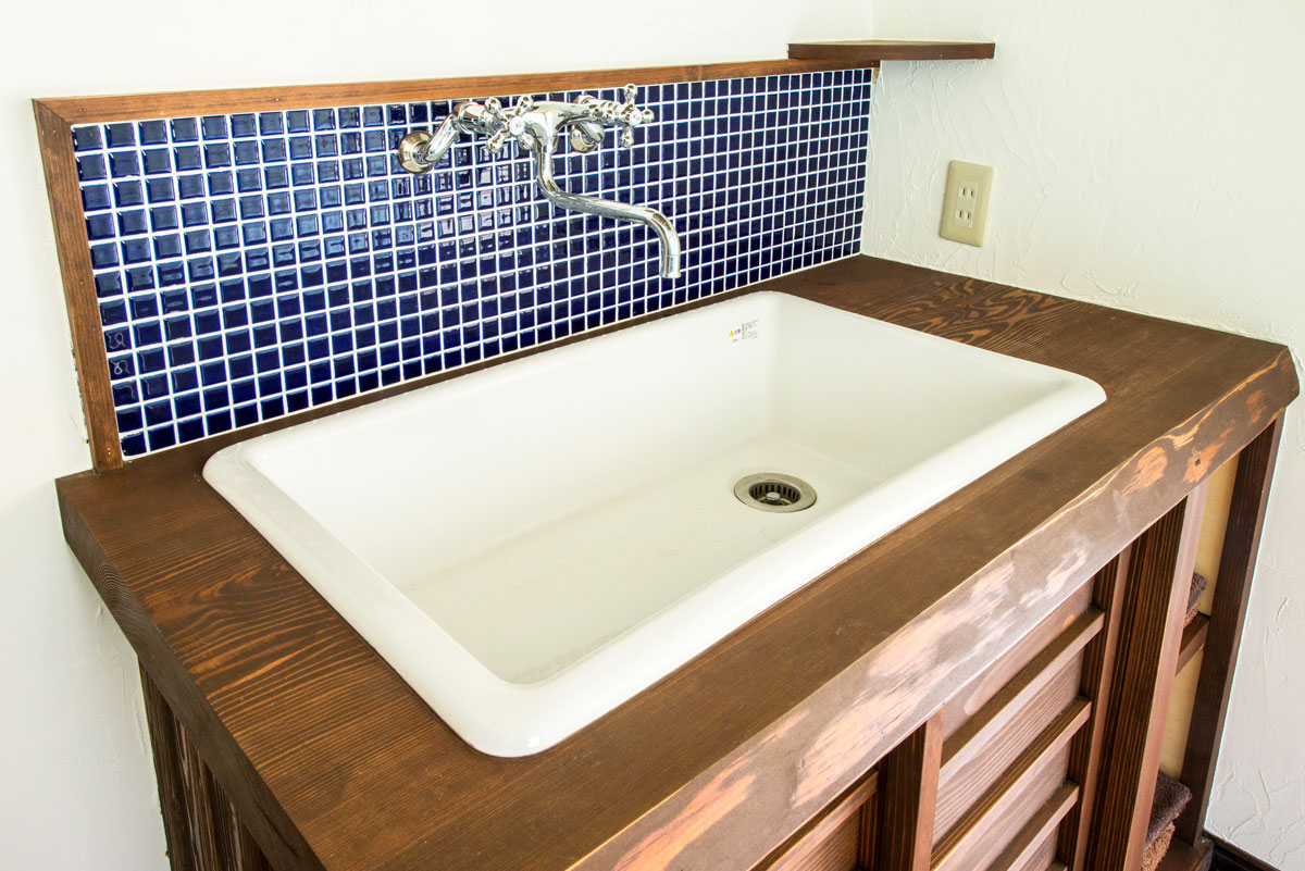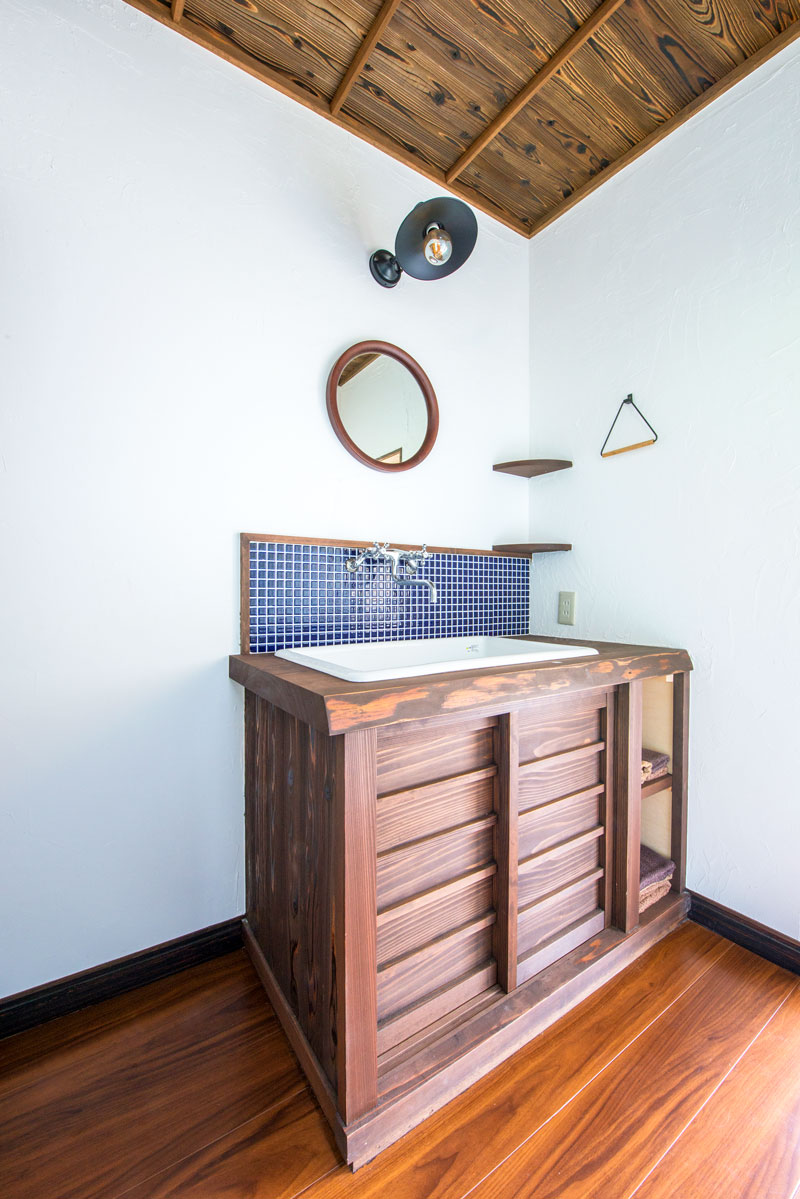希望したのは、水廻り設備を昭和レトロなデザインに変えること。キッチンと洗面台は、既製品を撤去して水に強いヒノキで造作。カビが発生しにくい塗料で経年したような趣を醸す焦げ茶色に塗装しました。壁はご主人が漆喰を手塗りして、手元周りにはブルーの正方形タイルを。レトロな水栓金具にもこだわり、新しくもどこか懐かしい佇まいが完成しました。