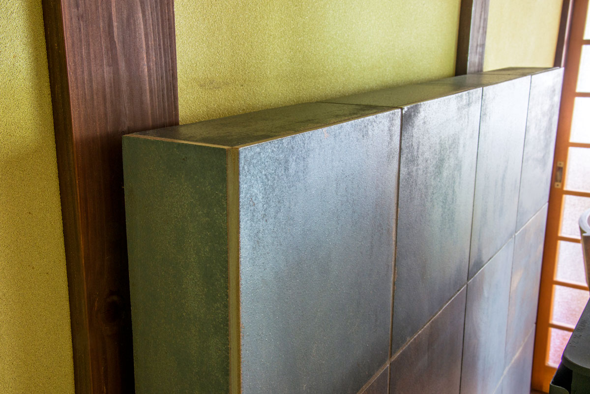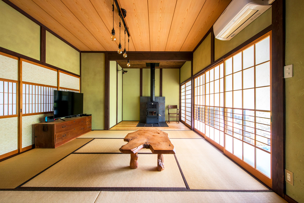 冬の寒さ対策と調理用を兼ねて希望した薪ストーブは、リビングに隣接した納戸に置くことに。壁を取り払い、構造補強をして畳敷きのリビングとつながる板間に変更。和の雰囲気に合わせて、瓦のような重厚感のあるタイルをストーブ周りに貼りました。