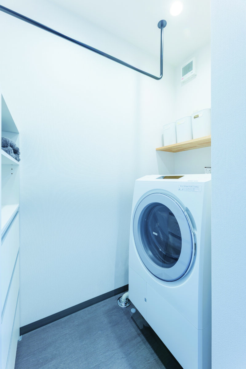 洗濯機置場と収納棚、ハンガーポールを設置したランドリースペース。室内干しもできて、共働き夫婦の家事負担を軽減。