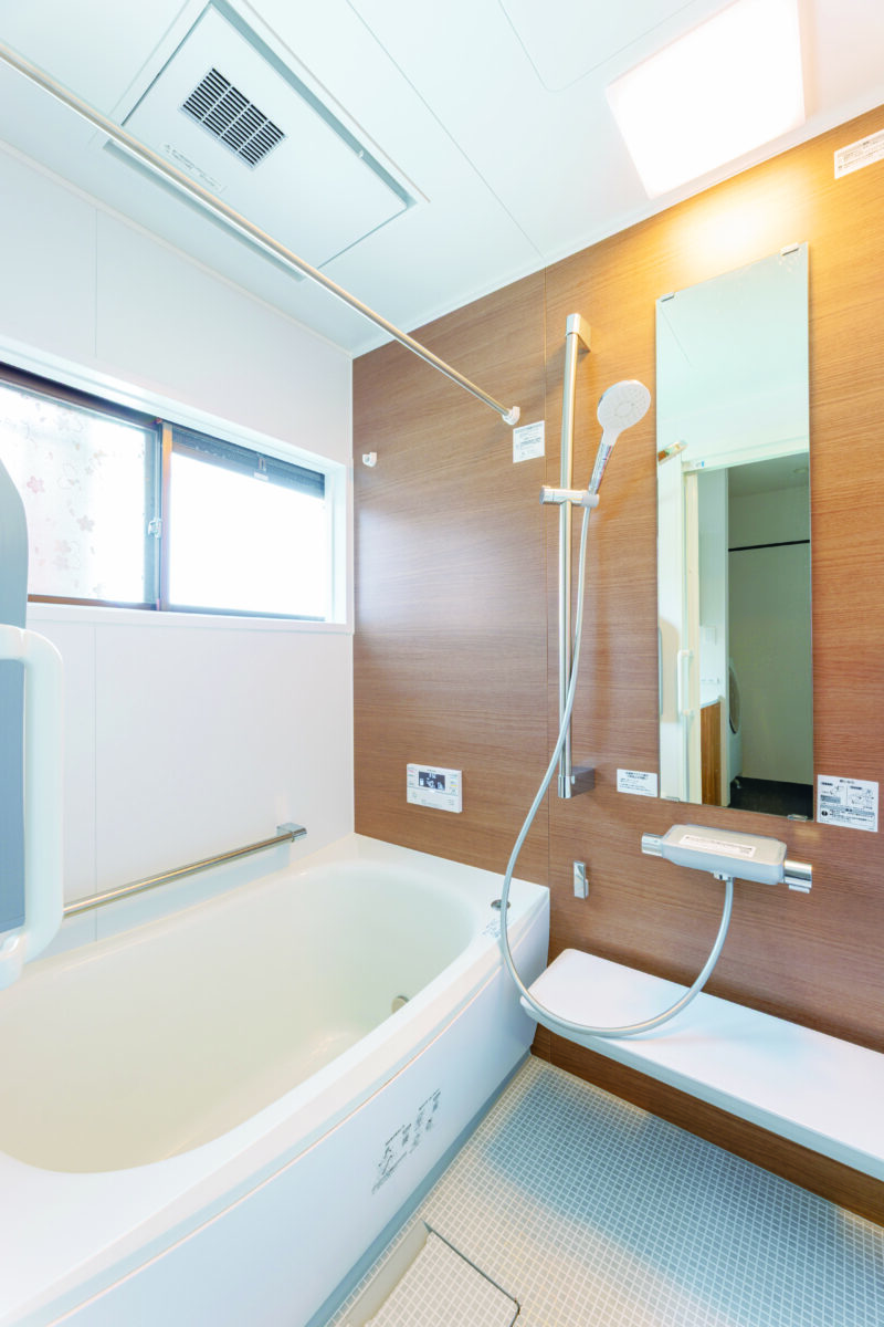 浴室暖房乾燥機を備えたユニットバスに交換。アクセントパネルには木目調のデザインを選びました。