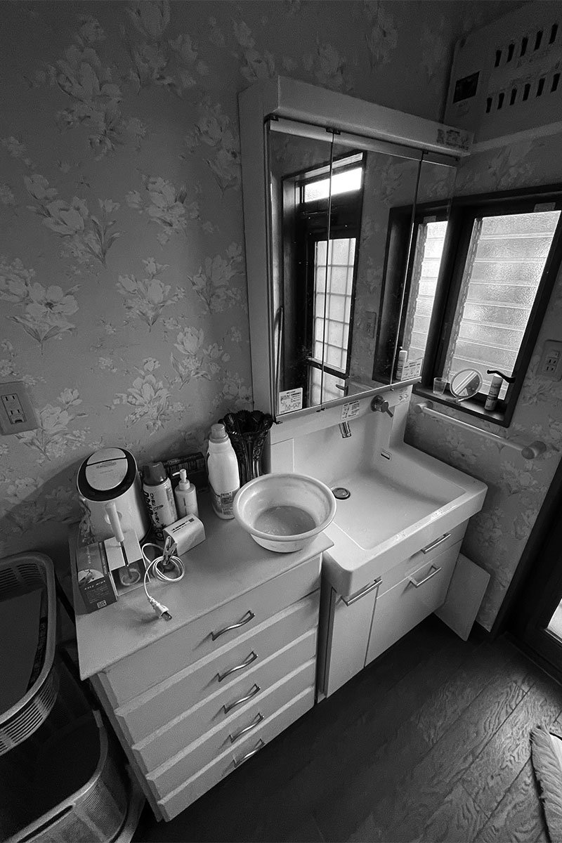 洗面室を拡張して、洗面台の裏にランドリースペースを追加。洗面台はキッチンと同じ無垢材のデザインを選び、ウッドフレームの鏡収納とブラケットライトを設置。