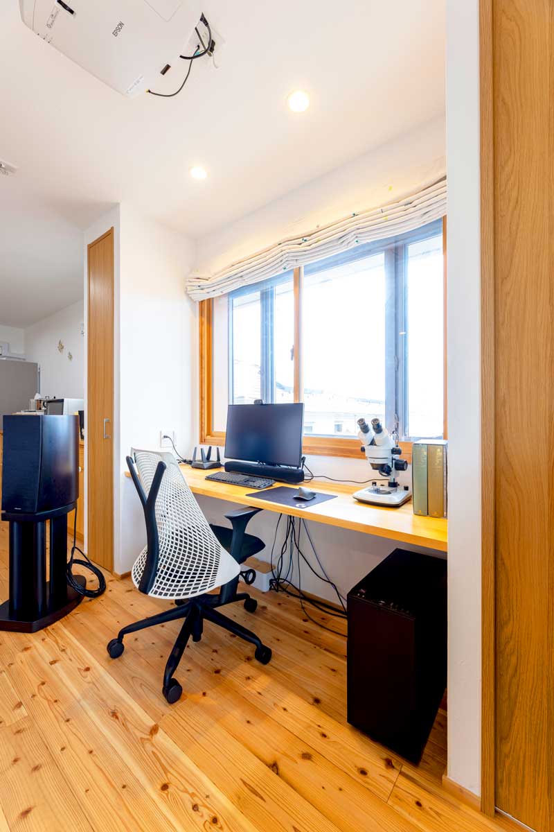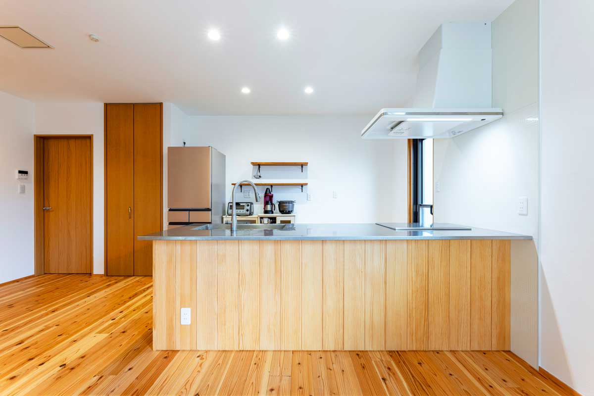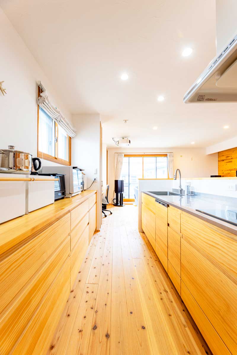 さらに防音と 断熱を兼ねて、ペアガラスの既存窓に内窓を追加。階下への音漏れに配慮してリビングドアには防音扉を採用し、夜間でも気兼ねなく好きな映画や音楽に没頭できる空間になりました。壁を撤去して開放的になったDKには、オープンなアイランドキッチンを設置。床と同じ杉の板で覆い、ナチュラルな内装に調和させました。
