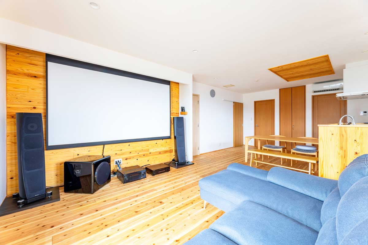 施主さま世帯が生活する2階で最もこだわったのはLDK。本格的なシアタールームにしたいというご主人の希望で、壁づけテレビの上に巻き上げ式のプロジェクター用スクリーンを設置。プロジェクターやスピーカーの配置に合わせ天井に埋め込みました。